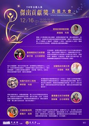 114年公務人員傑出貢獻獎業經考試院組成評審委員會評選出6名得獎人及6組得獎團體。為表揚得獎者傑出事蹟,考試院訂於114年12月16日(星期二)下午1時20分於考試院傳賢樓10樓大禮堂舉行表揚大會。
