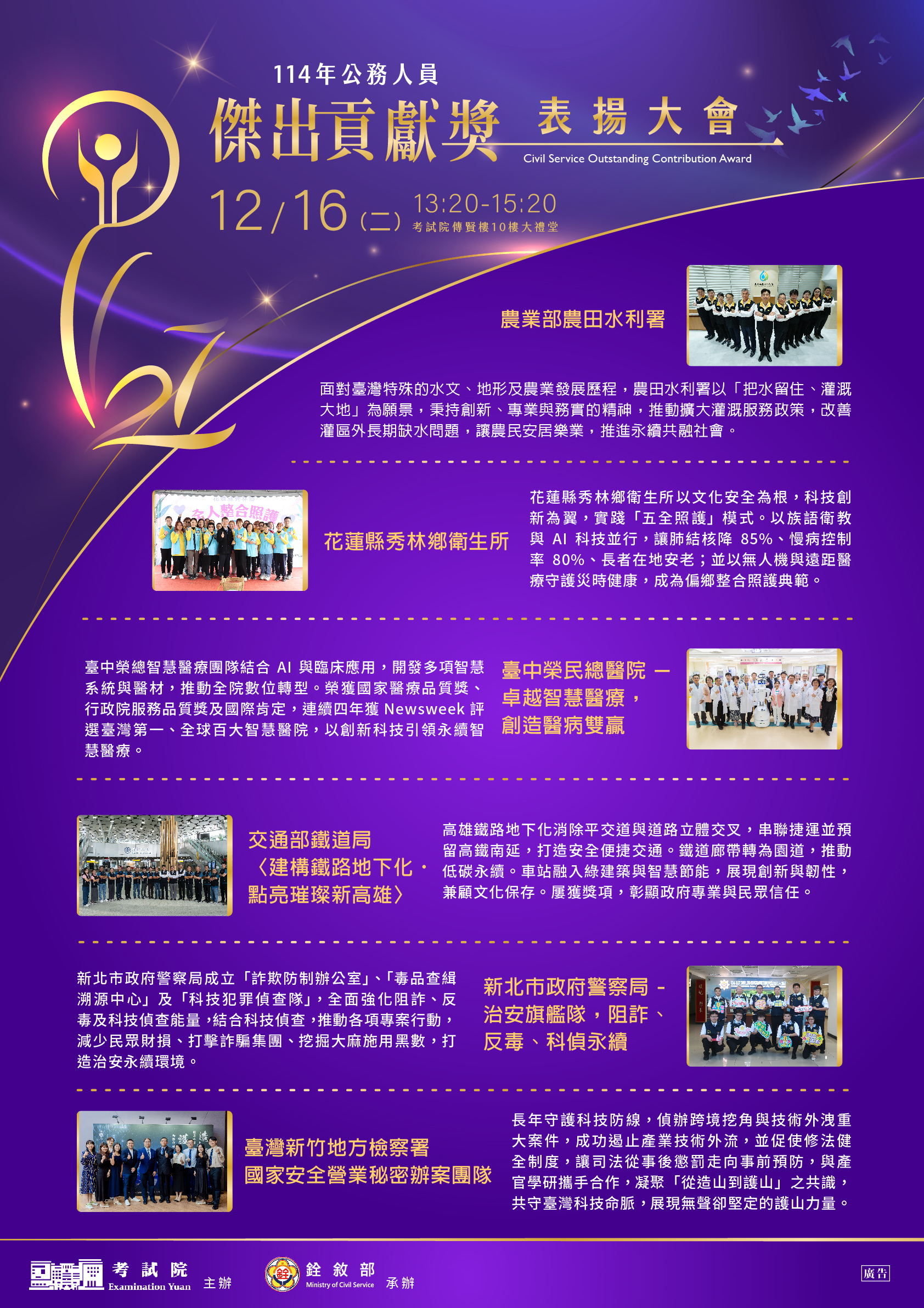 銓敘部有關「114年公務人員傑出貢獻獎表揚大會」電 子海報